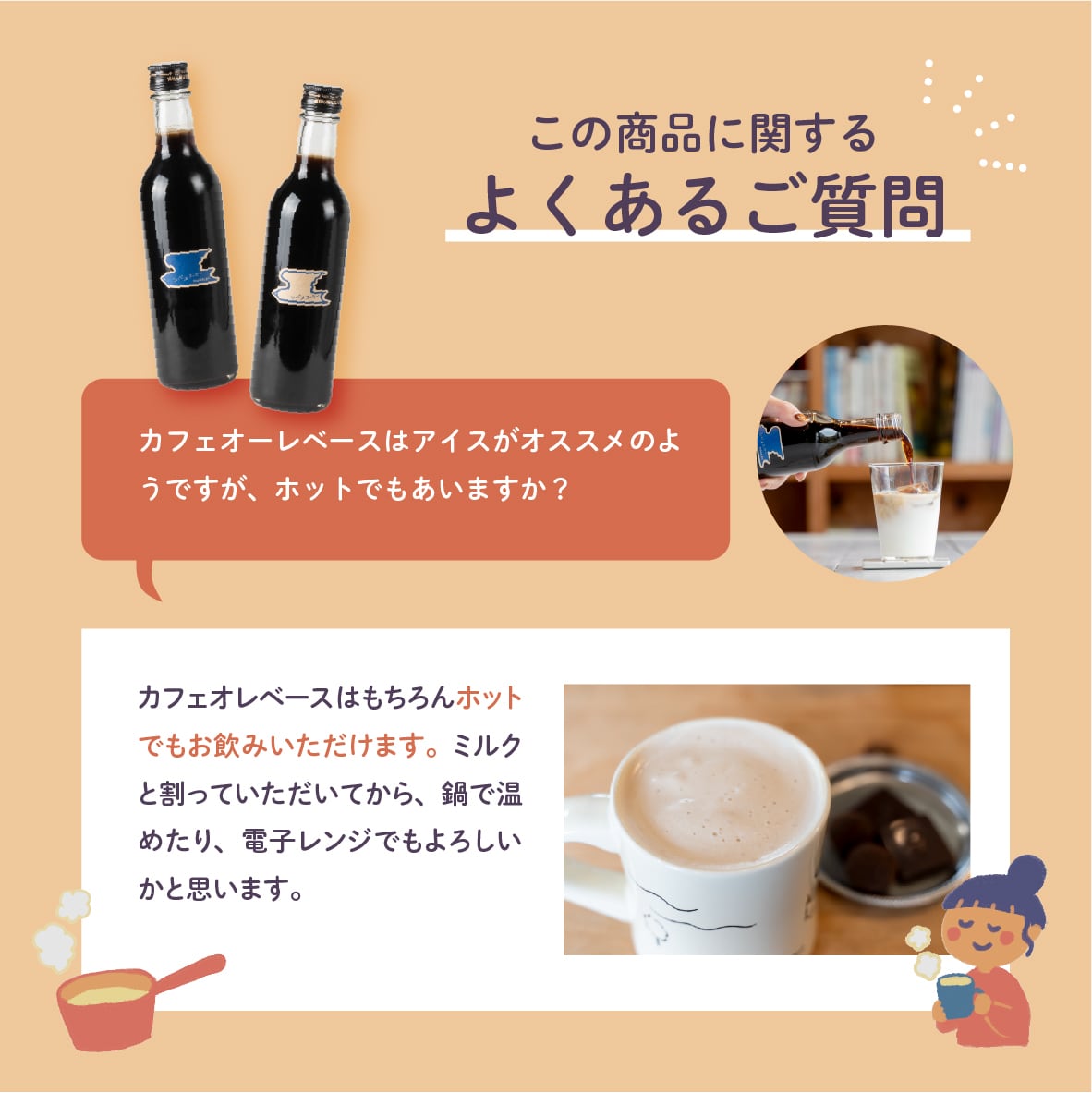 牛乳4に対してカフェオレベース1を目安に入れていただけると、手軽においしいカフェオレがお飲みいただけます。(とはいうものの計量カップで厳密に量ることをすすめるわけではなく、牛乳の入ったコップにどぼどぼと入れていただき、ほどよくなったらお飲みいただき、足りないようなら追加いただくことで、自分好みの塩梅にしてみてください)