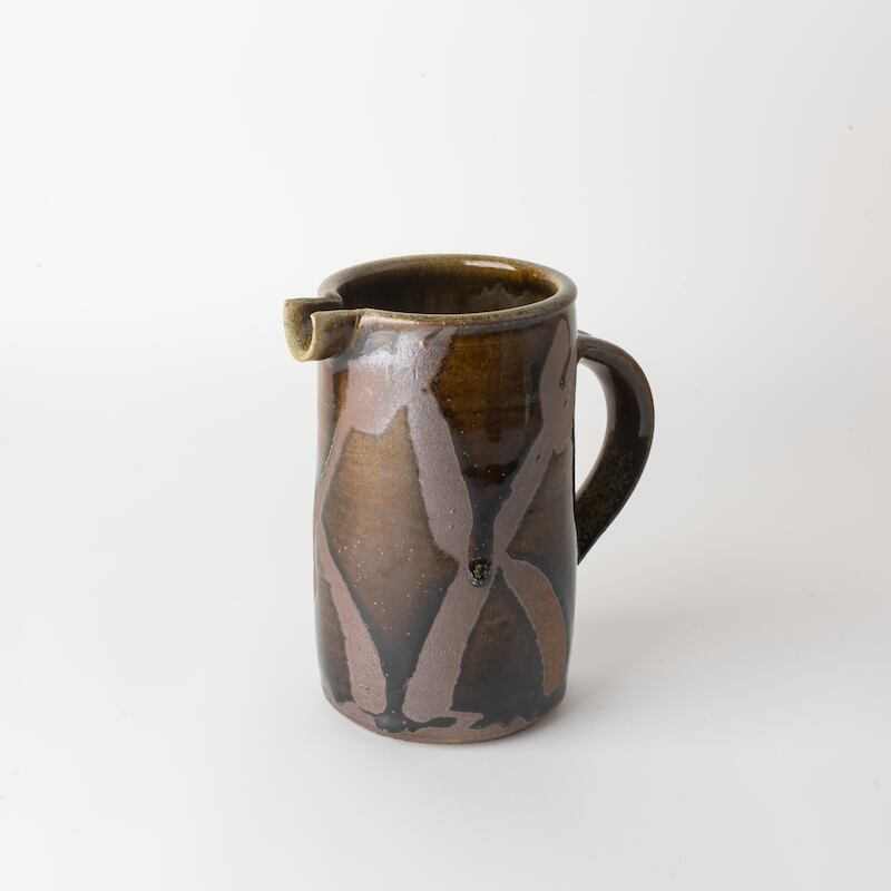 ななめ格子:抜き絵を蝋抜きでほどこし、飴釉(あめゆう)を全体にかけて焼いたもの